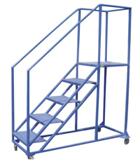 登高車的一面設有臺階(臺階旁邊有扶手)供使用者登上平臺,平臺另三面配有護欄保證作業者的安全。平臺作業面一般大小可容納1-2人站立、轉身、移動。使用者可在登高車的平臺上完成從貨架等高處堆取物品等動作。另外,登高車配有腳輪,可供使用者推拉轉向移動,方便快捷。其中有前腳輪上配備有輪剎,剎住后,登高車固定不可移動,使用者可安全放心的登高操作。